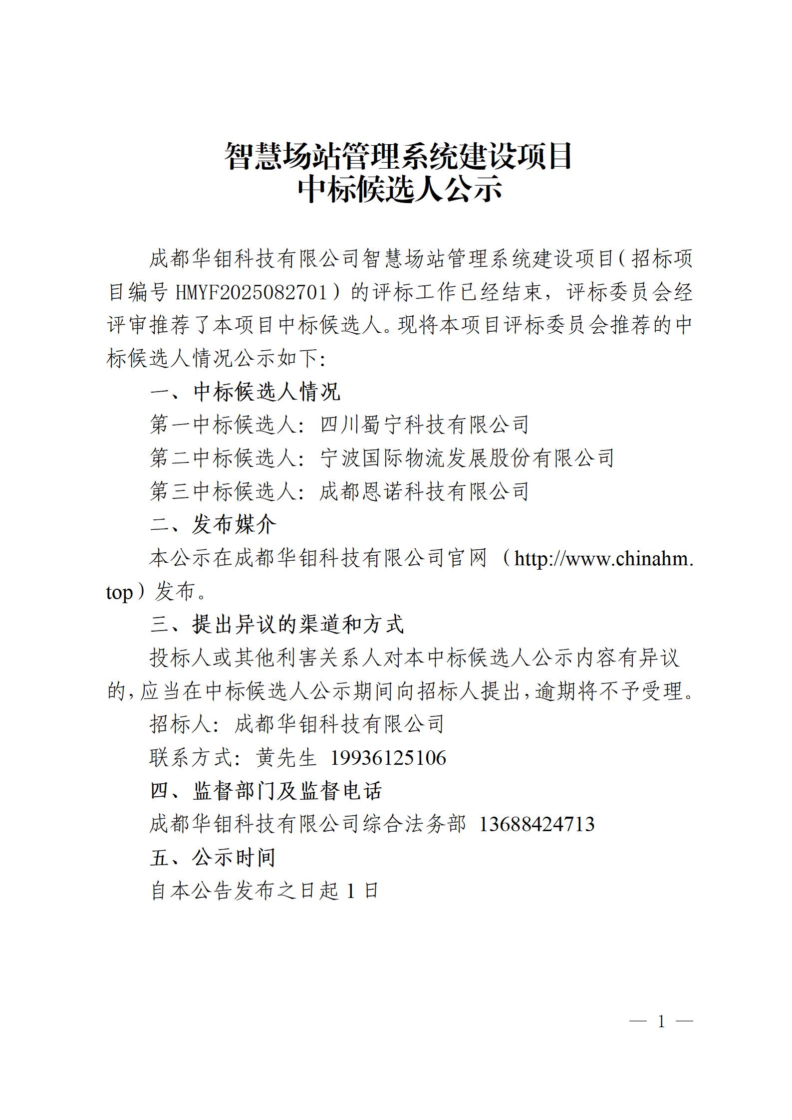 智慧场站管理系统建设项目中标候选人公示