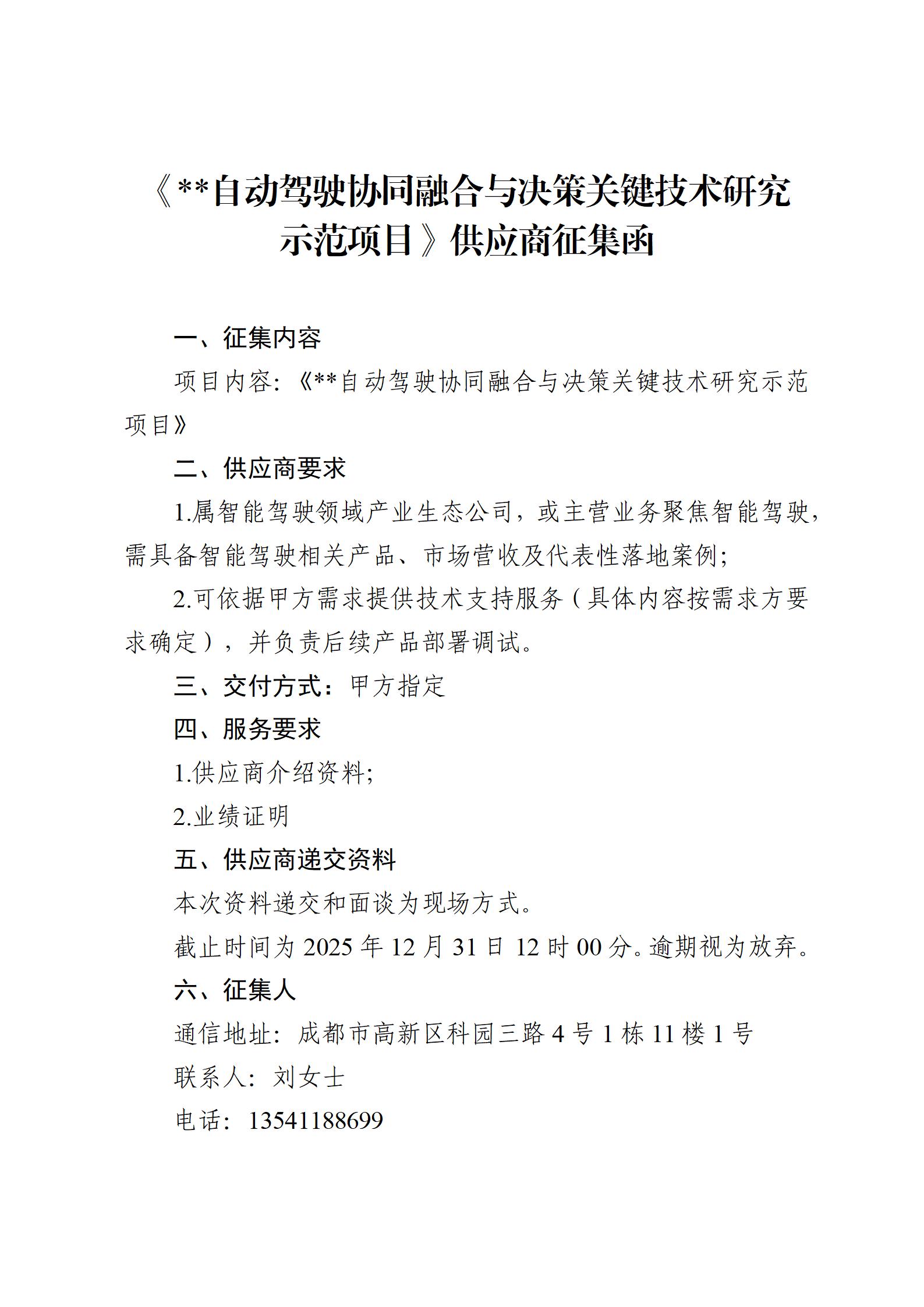 《**自动驾驶协同融合与决策关键技术研究示范项目》供应商征集函