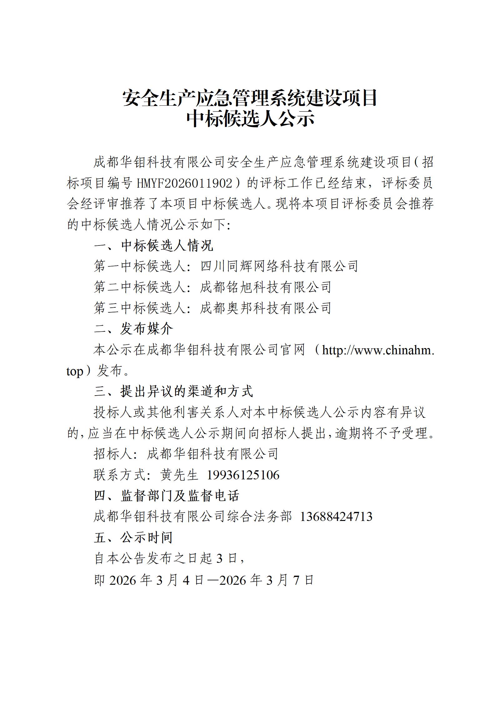 安全生产应急管理系统建设项目中标候选人公示