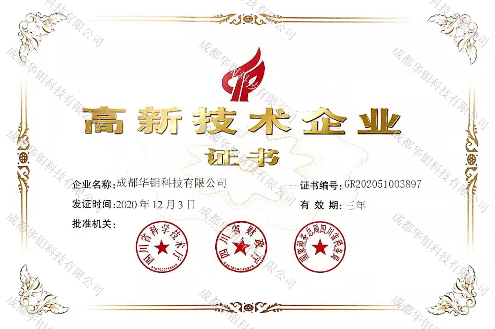 2020年12月03日,成都华钼科技有限公司获得“高新技术企业”证书。