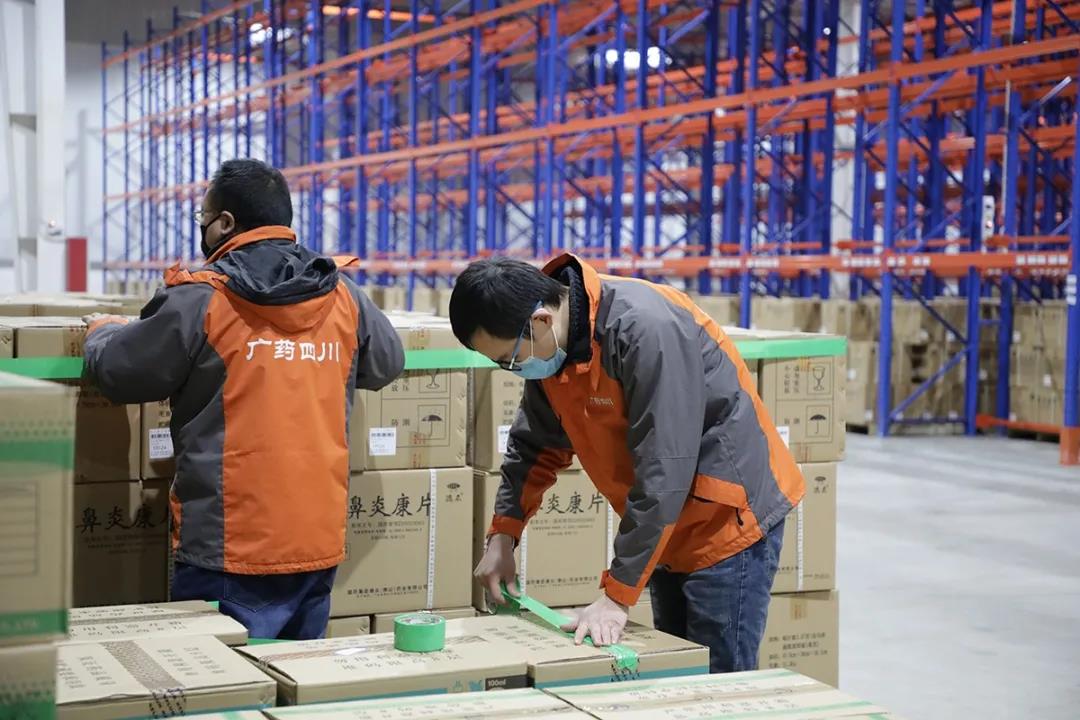 在四川广药出货仓内,两名工作人员正在打包医药类产品,保障常规医疗物资供应。