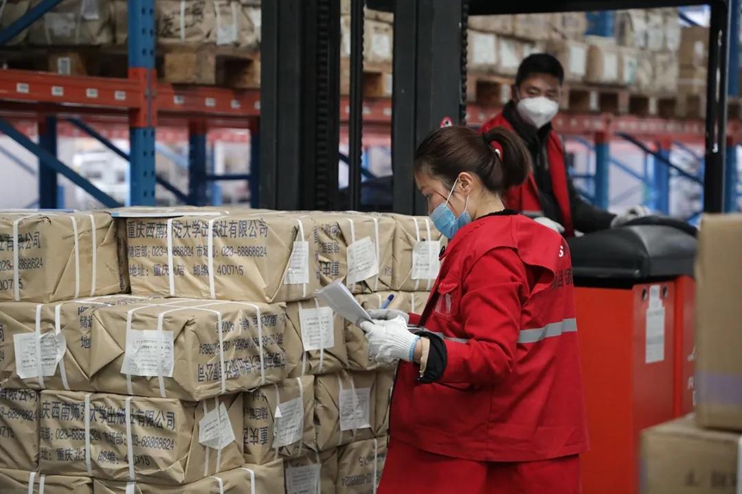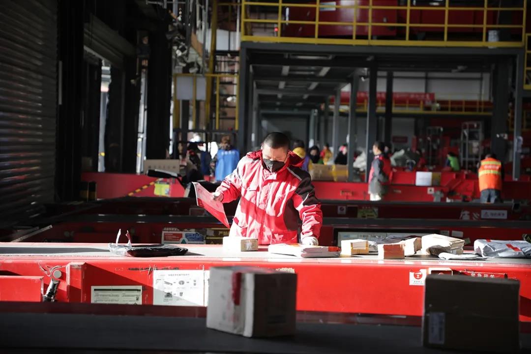 在京东青白江分拨中心内,分拣员正有条不紊地整理快递,全力推进物流保供工作。