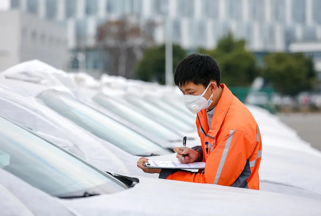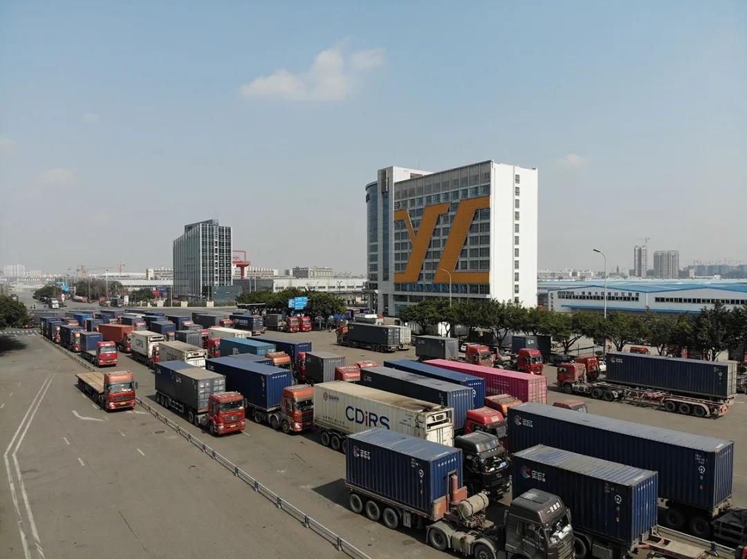 成都铁路集装箱中心站门口,来自不同物流企业的集卡车繁忙而又有序地排队等待消毒、检查,随后进入到中心站运送货物。