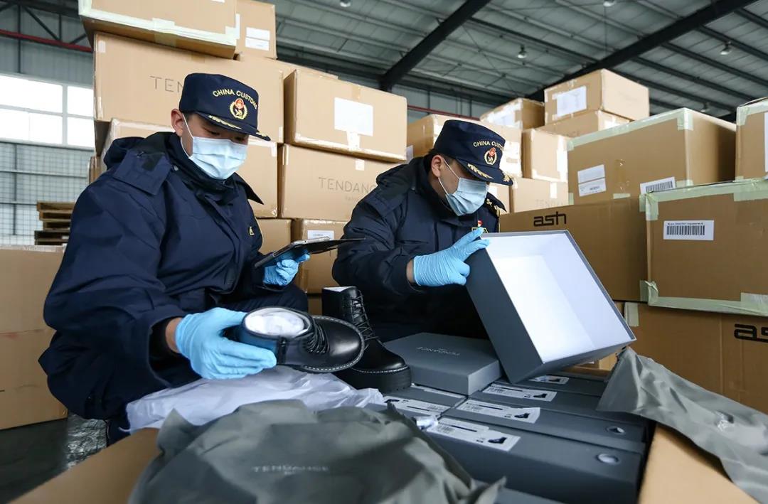 在成都铁路口岸监管区,海关工作人员正在查验即将发往欧洲的出口女鞋。